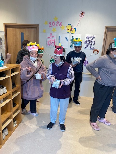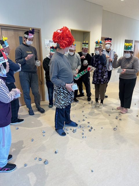 今年は利用者さんに鬼の役をしてもらいました。鬼のパンツを履いてニコニコです♪